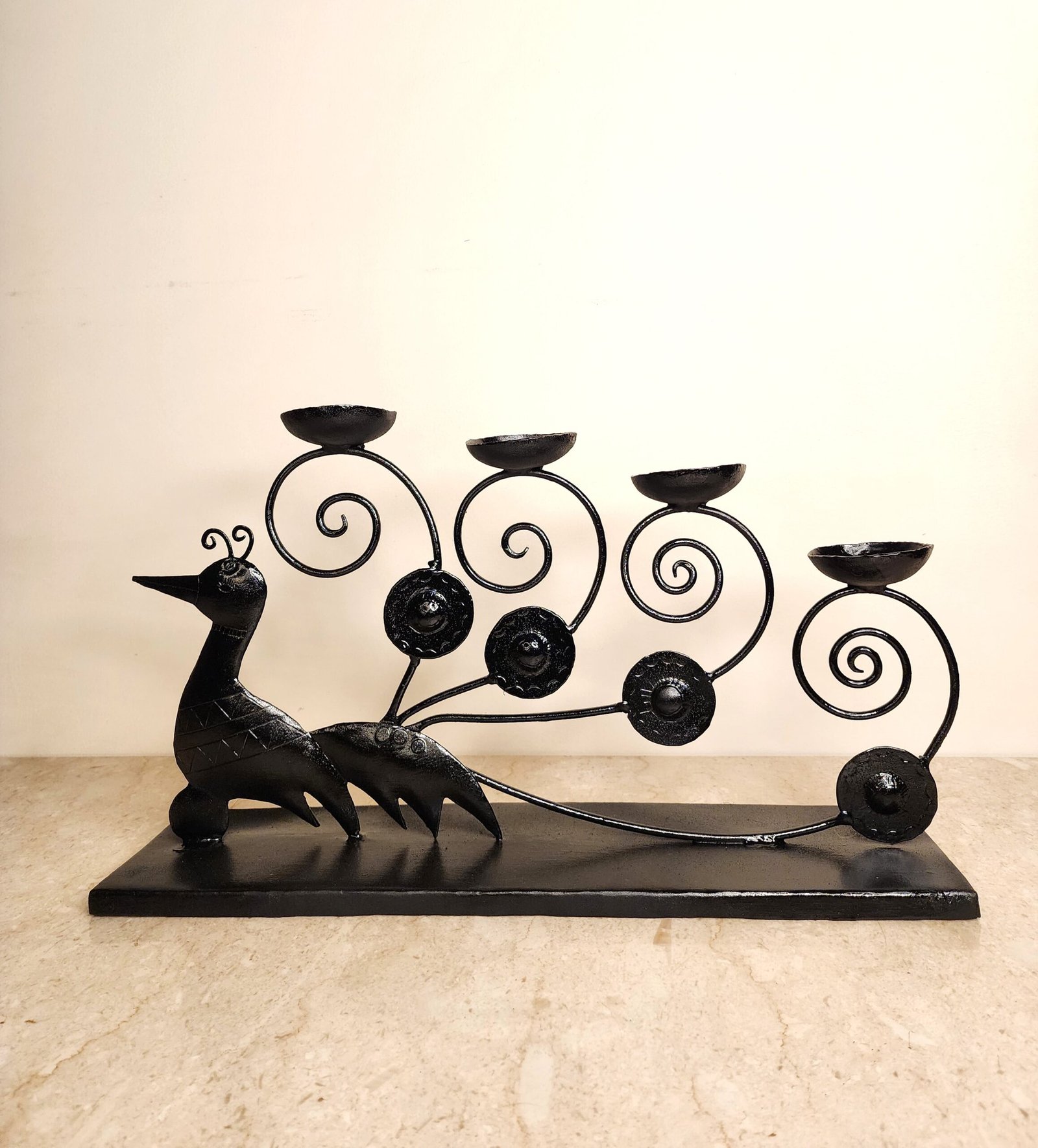 The Dancing Peacock Candle Stand by RootMark is a striking handcrafted décor accent inspired by the elegance and movement of the peacock, a timeless symbol of beauty and grace. Crafted from metal and finished in a rich matte black tone, this candle stand features artistic spiral holders that enhance the glow of candlelight.