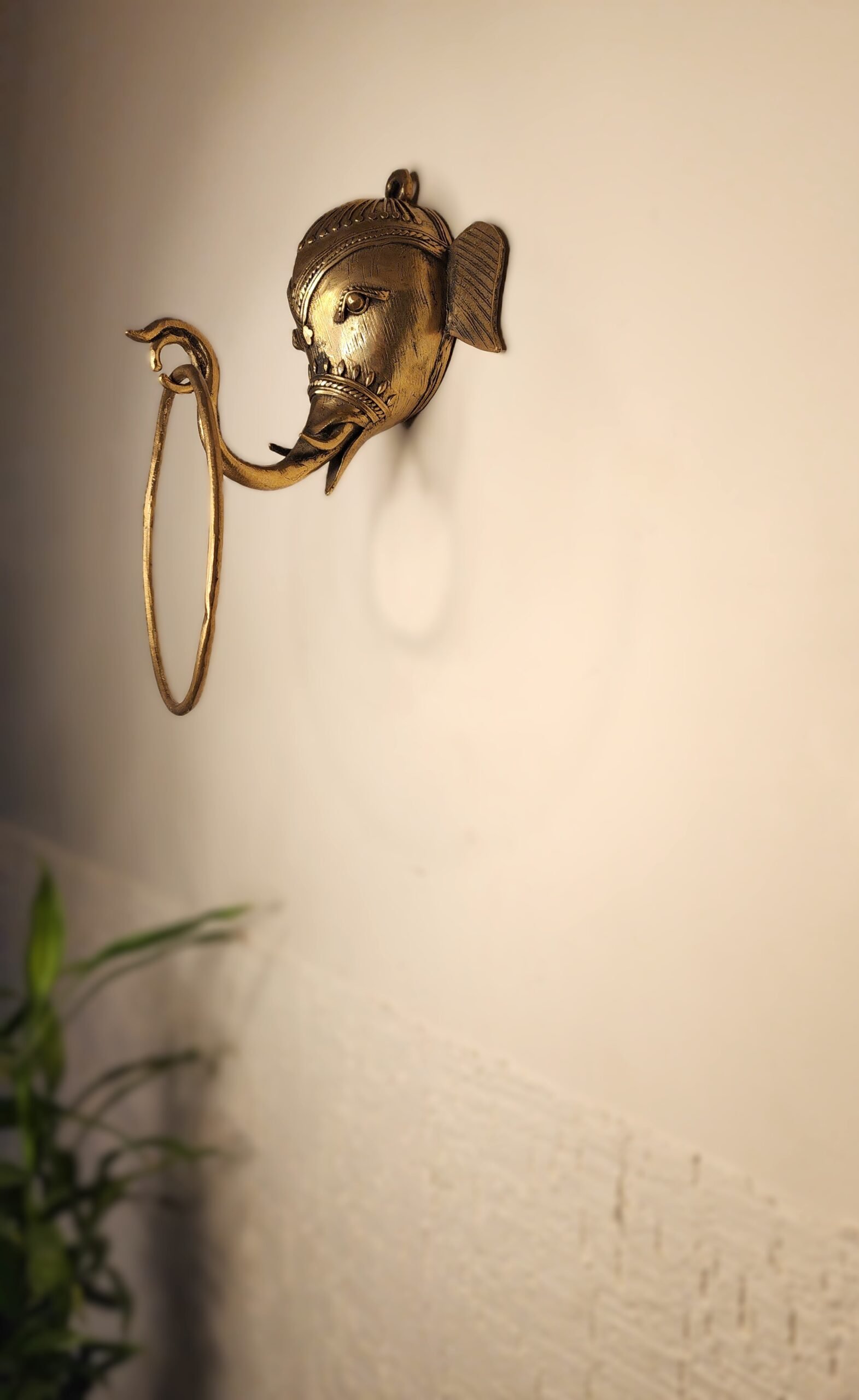 The RootMark Elephant Towel Holder is a handcrafted metal wall accessory inspired by traditional Indian design. Featuring an intricately detailed elephant head with a sturdy towel ring, it blends functionality with timeless ethnic elegance.