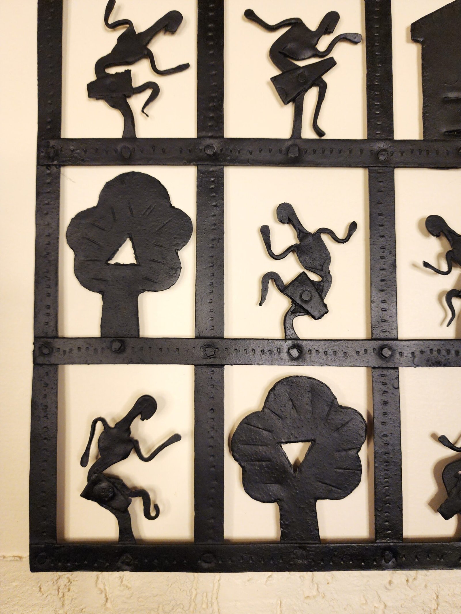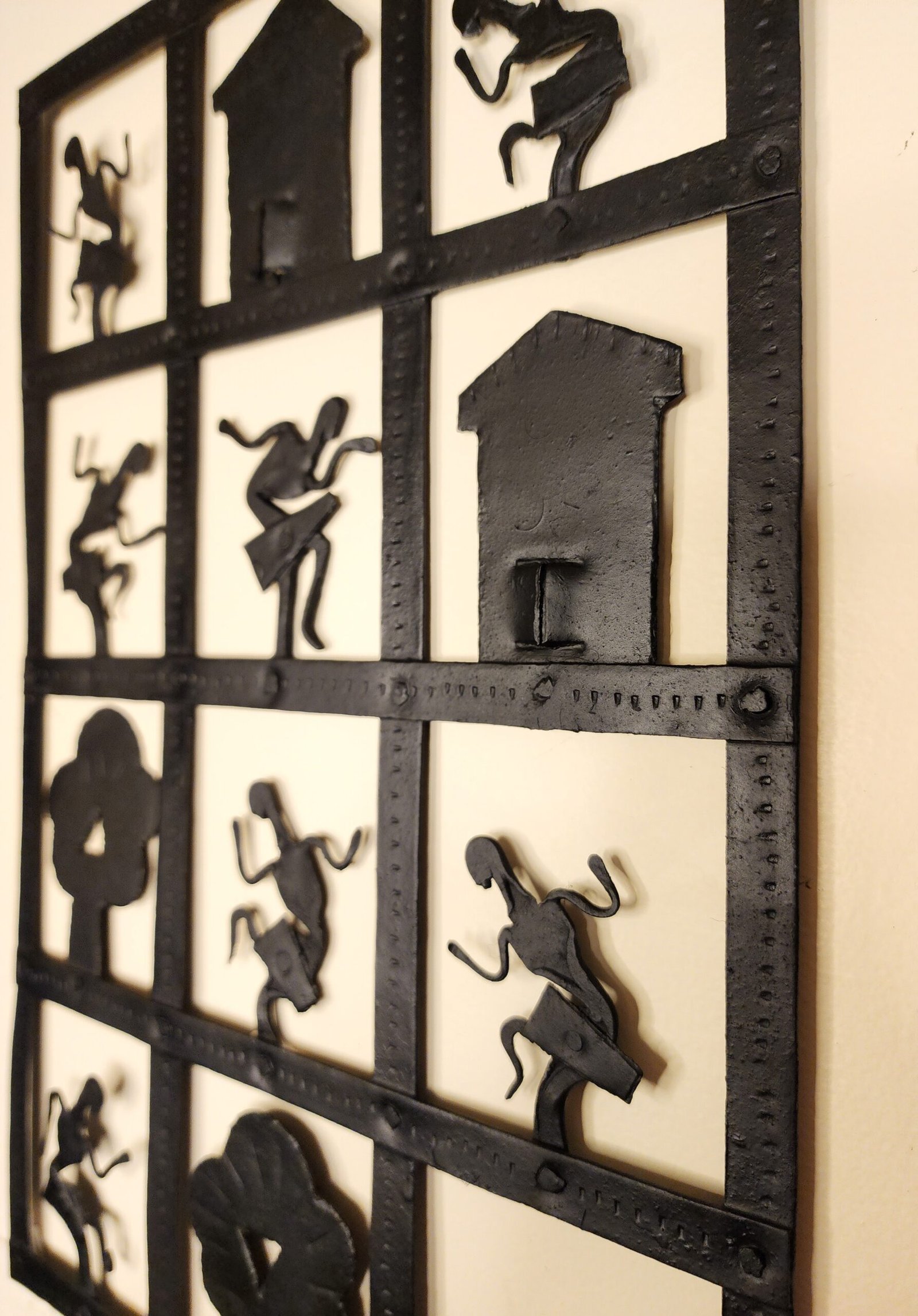 The Forest Life Tribal Wall Panel by RootMark is a striking handcrafted metal artwork inspired by the simplicity and rhythm of tribal living in harmony with nature. Designed in a grid-style layout, the panel features stylized human figures, trees, and huts that together tell a visual story of forest life and community.